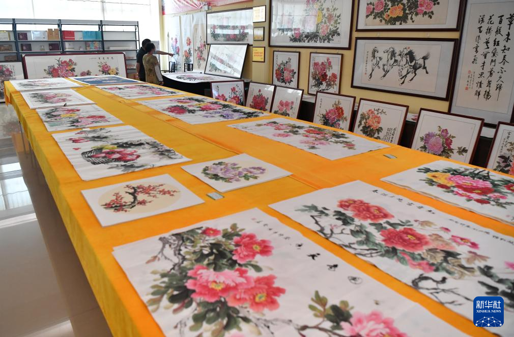 7月26日,工作人員在平樂社區的牡丹畫創意產業園區內查看裝裱后的牡丹畫。
