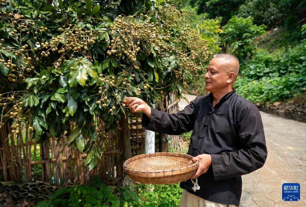 7月30日,一名坡芽村壯族村民在村子里摘龍眼。