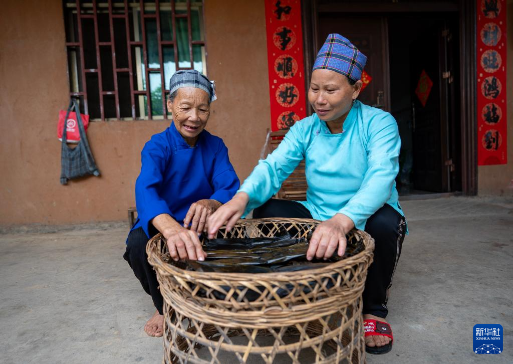 7月30日,兩名坡芽村壯族村民在自家院子里晾剛制作好的壯族美食褡褳粑。