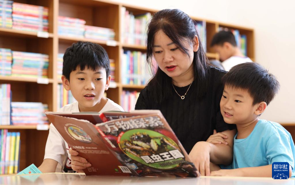 8月1日,學生和家長在貴州省銅仁市玉屏侗族自治縣圖書館閱讀。