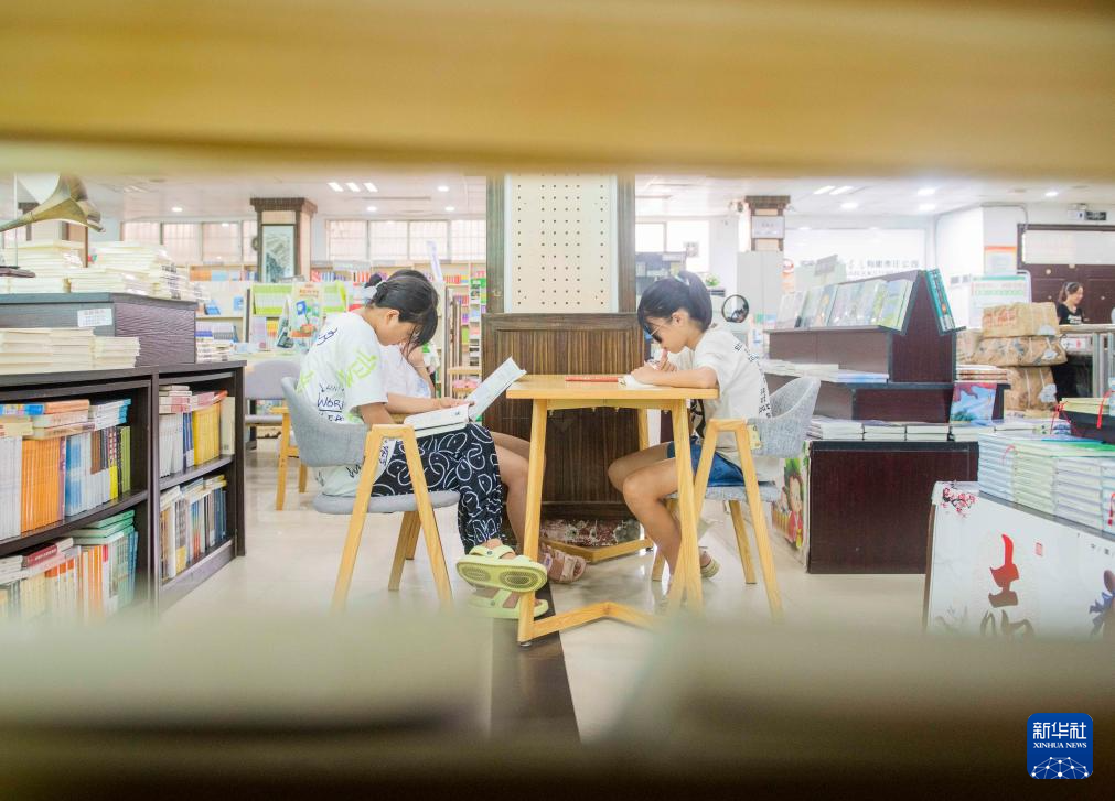 8月1日,幾名學生在湖南省永州市道縣新華書店閱讀。