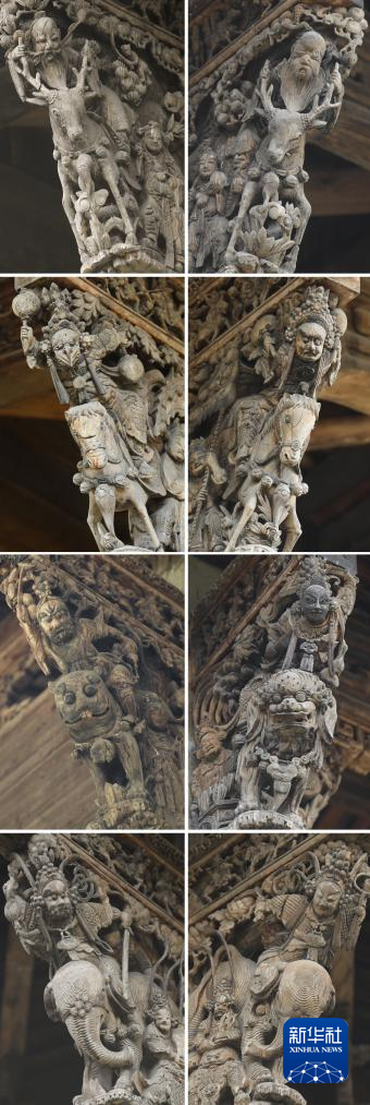 諸葛村丞相祠堂雕刻精湛的“牛腿”(拼版照片,8月1日攝)。