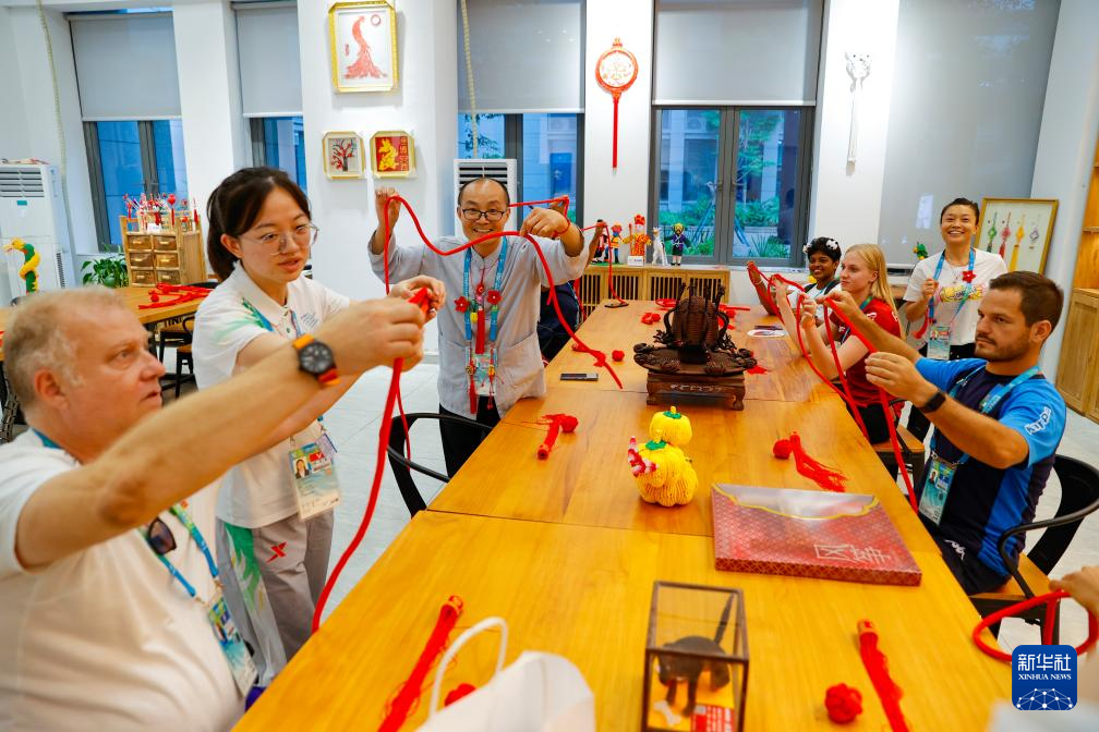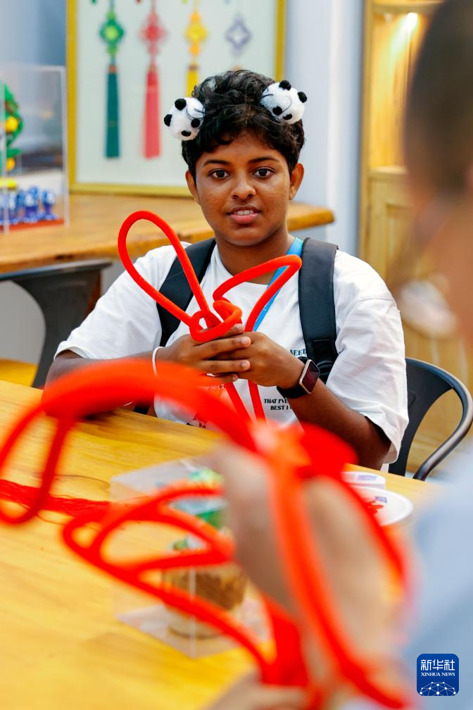 7月31日,在成都大運村,斯里蘭卡運動員哈西妮學習制作中國結。