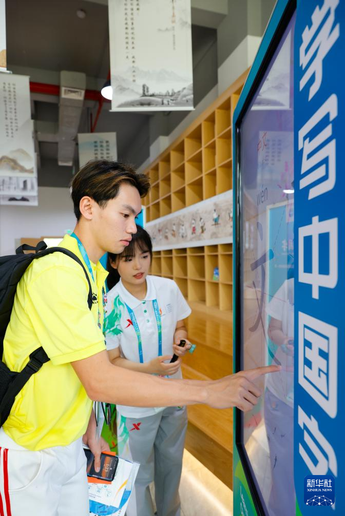 7月31日,在成都大運村的“漢語橋”中文學習互動體驗區,菲律賓運動員雷蒙德·巴勃羅 (左)通過數字互動電子屏學寫漢字。