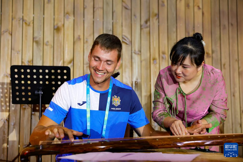 7月31日,在成都大運村,四川音樂學院中華傳統音樂研究院研究員王婷在教摩爾多瓦運動員亞歷山大·布洛特體驗古琴演奏技法。