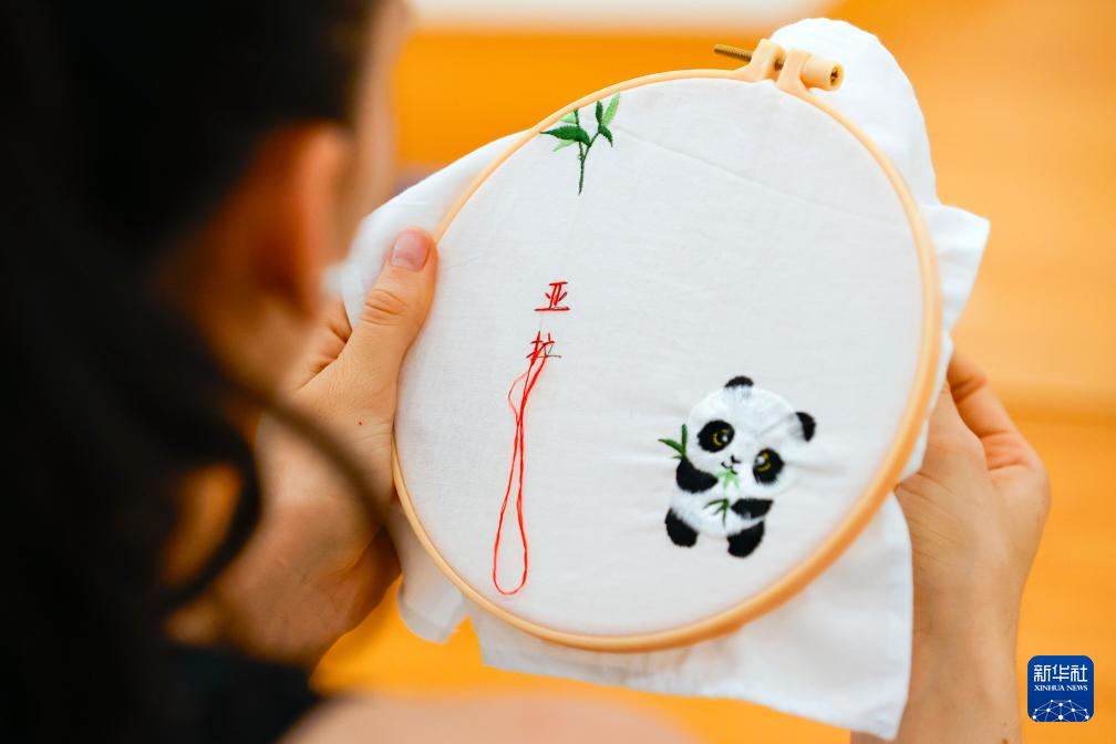 7月31日,在成都大運村,阿根廷運動員亞拉·納瓦羅體驗在蜀繡作品上繡上自己的中文名字。