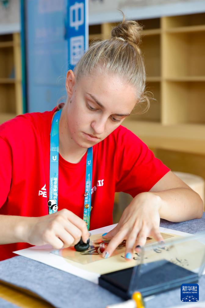 7月31日,在成都大運村的“漢語橋”中文學習互動體驗區,羅馬尼亞運動員斯特凡妮婭-帕特里夏·克蒂內安通過拓印的方式感受中國漢字的魅力。