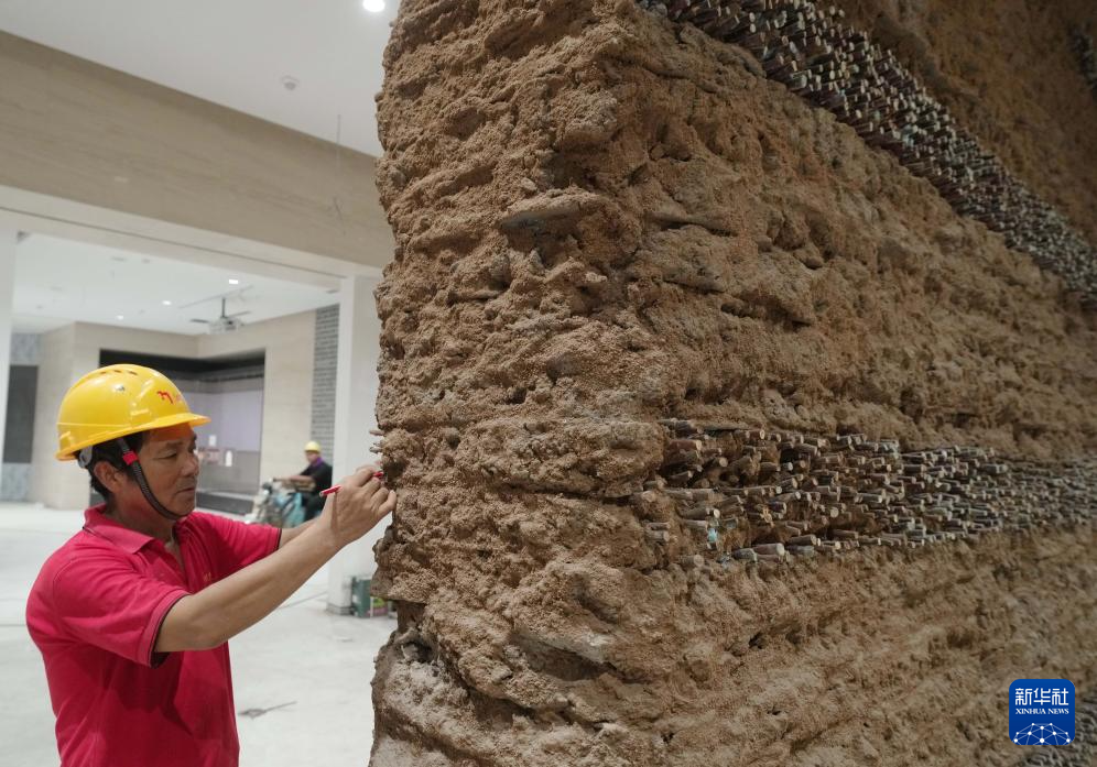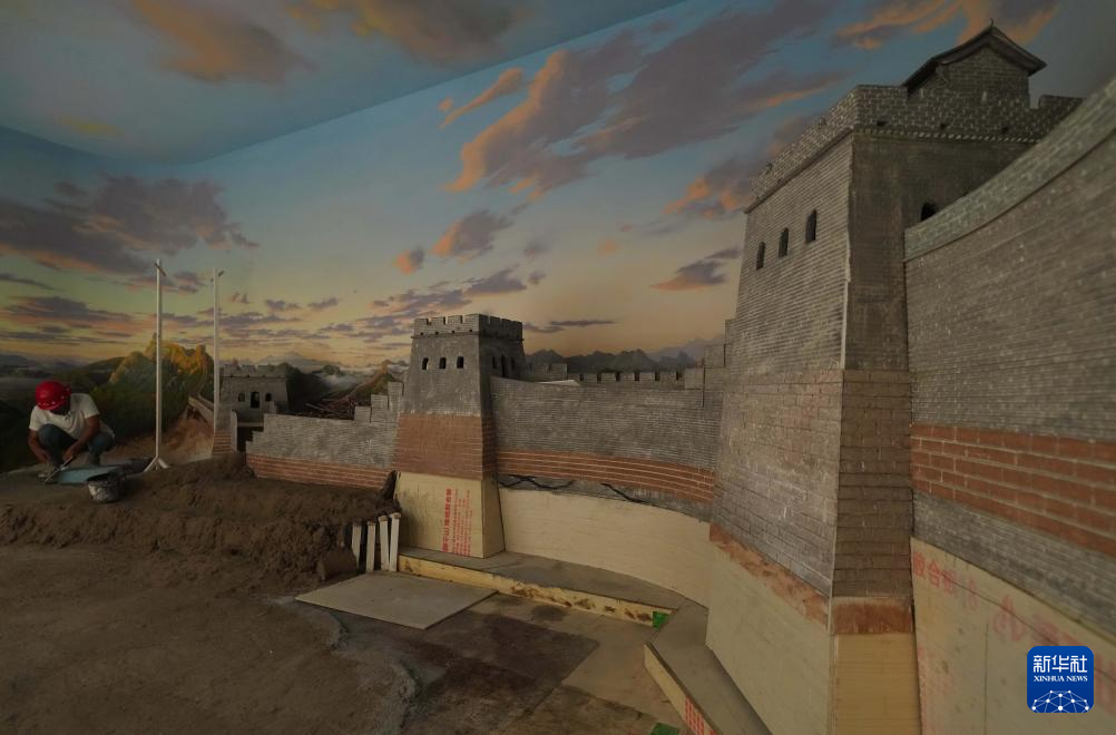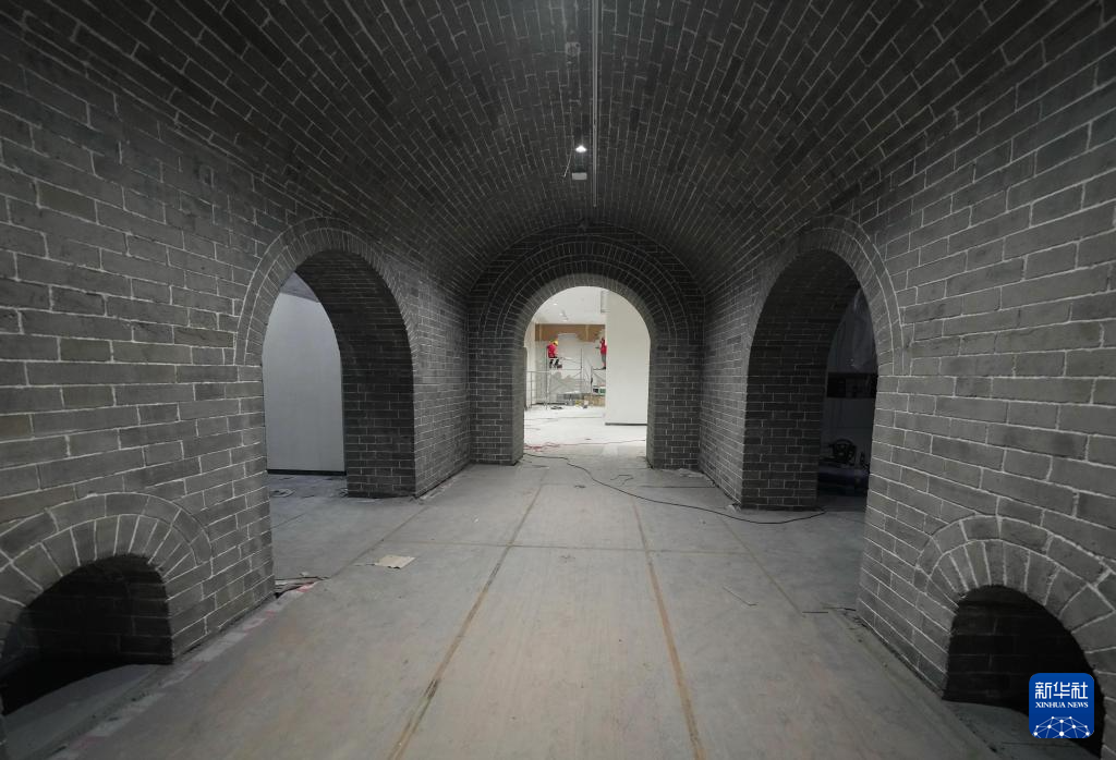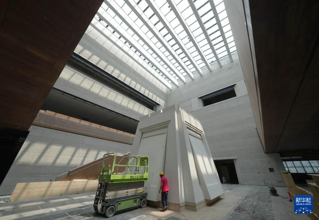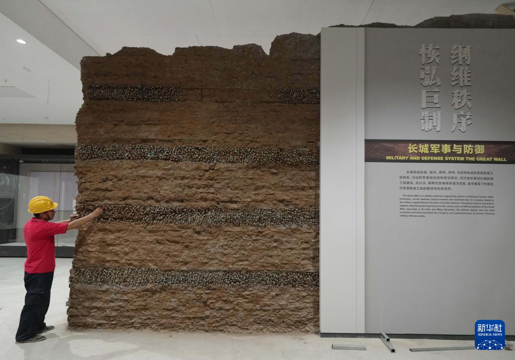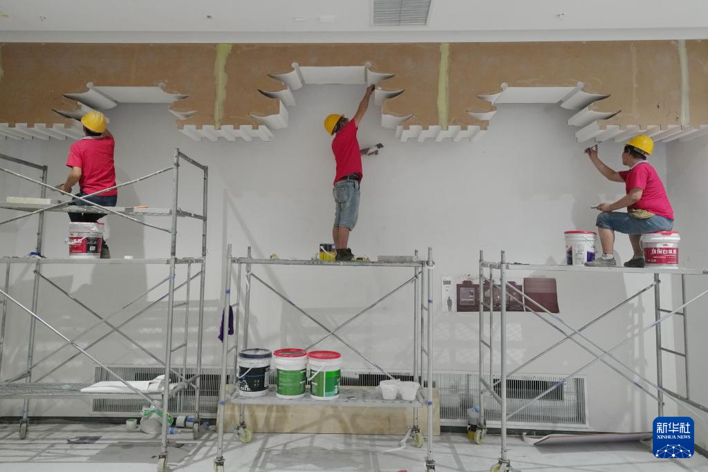 8月4日,工人在山海關中國長城博物館進行內部裝修施工。