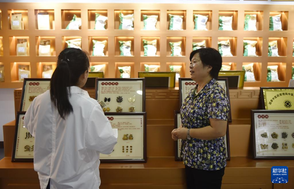 8月4日,在禹州中醫藥文化技藝傳習館,非遺項目“禹州中藥加工炮制技藝”代表性傳承人朱改蓮(左)向參觀者介紹中藥材知識。