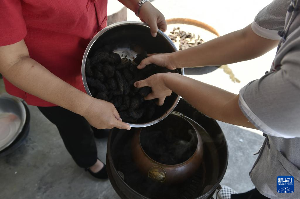 8月4日,在禹州中醫藥文化技藝傳習館,非遺項目“禹州中藥加工炮制技藝”代表性傳承人朱改蓮(右)展示中藥材“九蒸九曬”加工技藝。