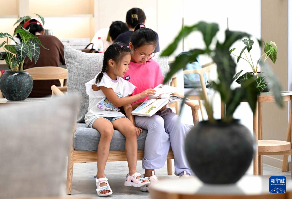 8月9日,小朋友在河北省石家莊市鹿泉區龍泉湖公園內一處公園書房閱讀。