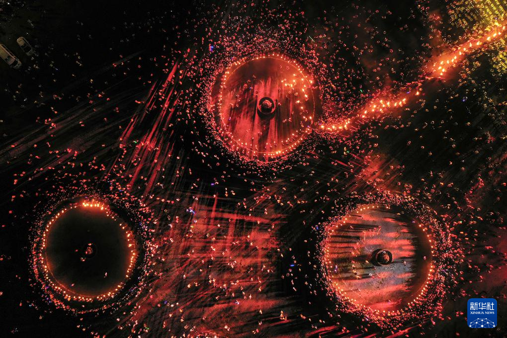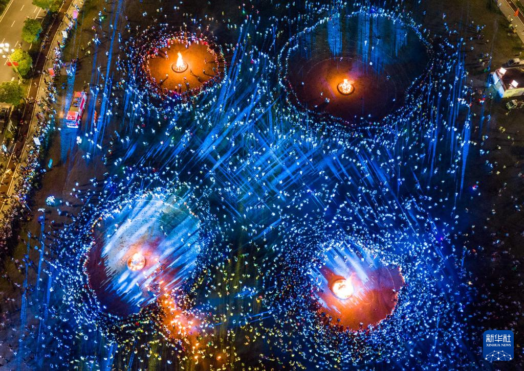 8月10日晚,群眾在貴州省畢節市百里杜鵑管理區鵬程街道花瓣橋廣場進行篝火狂歡(無人機照片)。