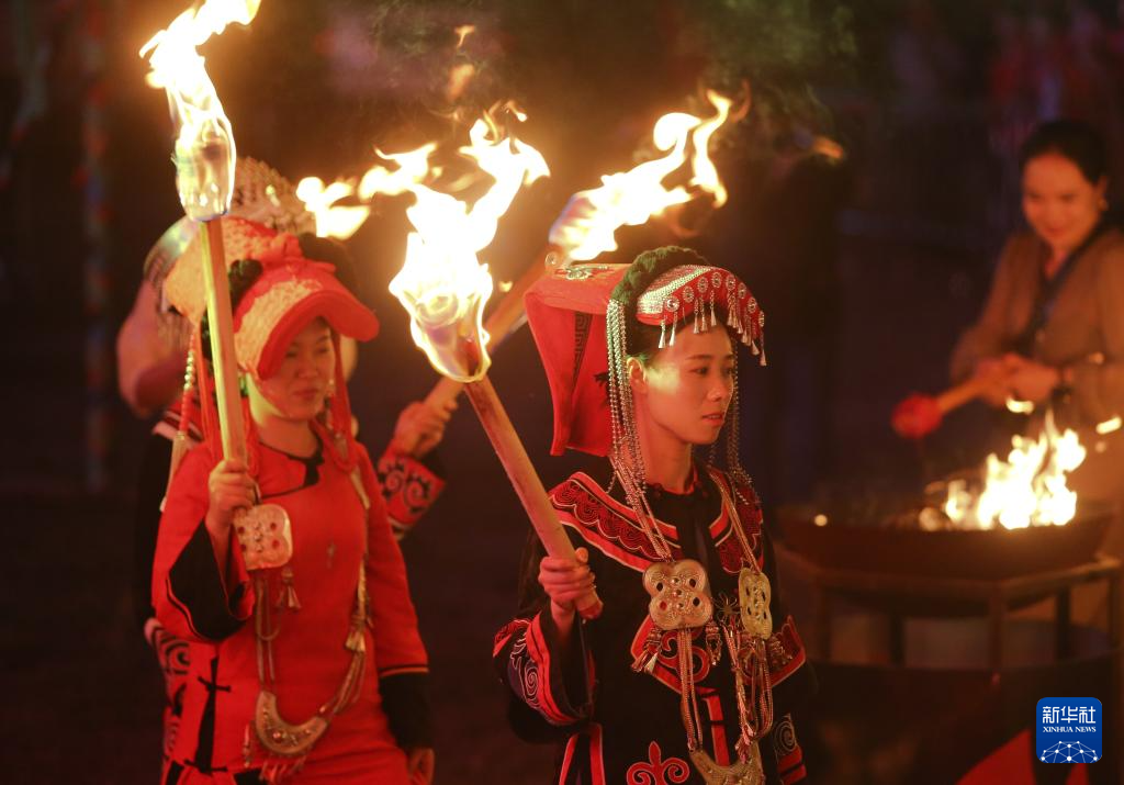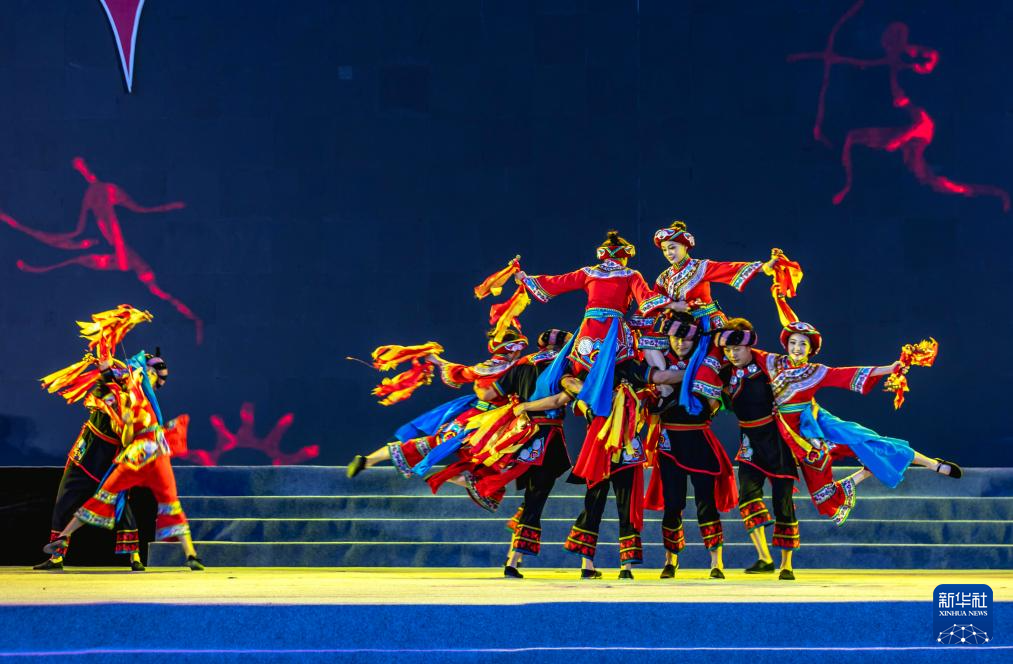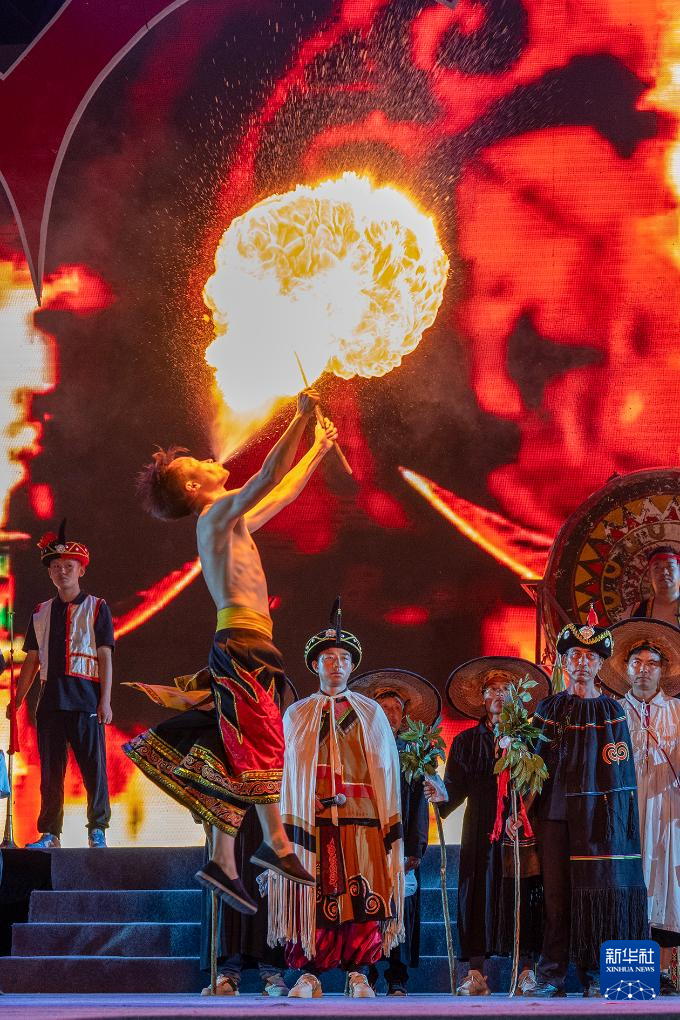 8月10日晚,演員在貴州省畢節市百里杜鵑管理區鵬程街道花瓣橋廣場彝族火把節活動中表演節目。