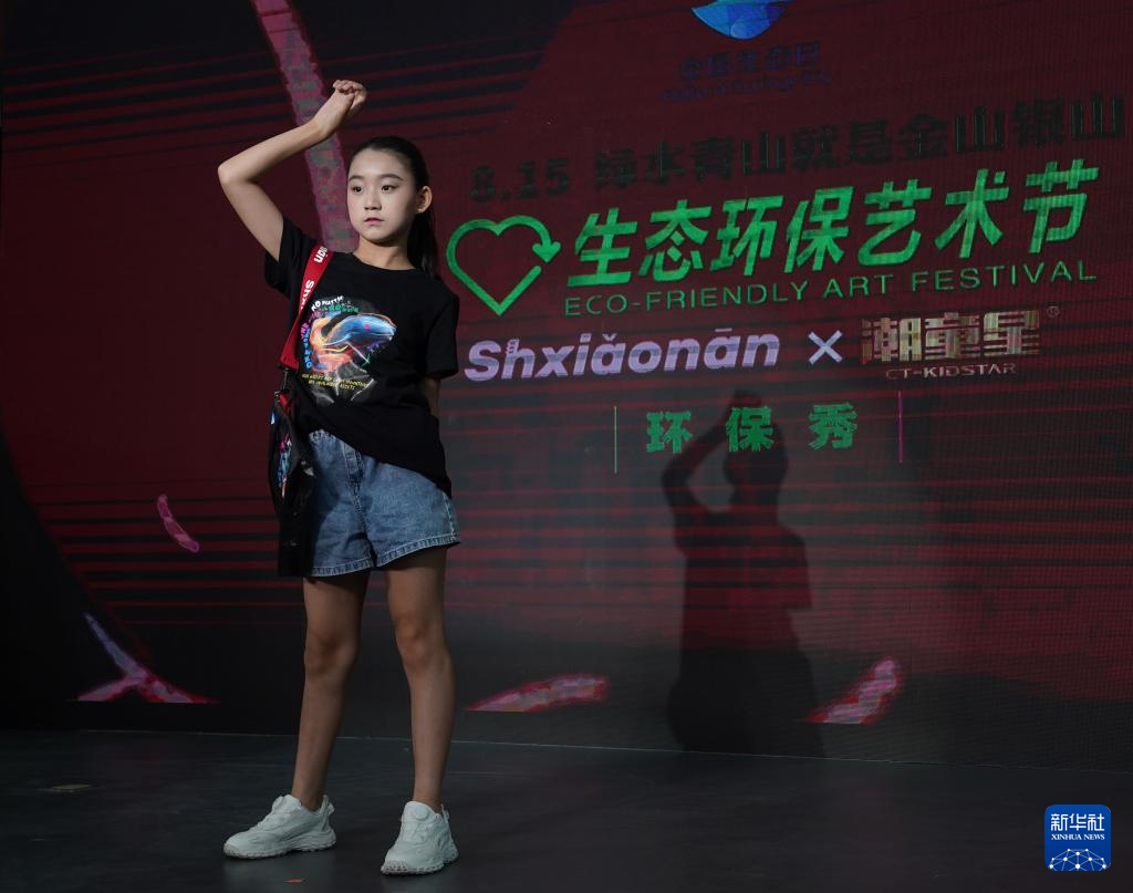 8月15日,模特在藝術節開幕式上展示用廢棄布料設計制作的禮服。