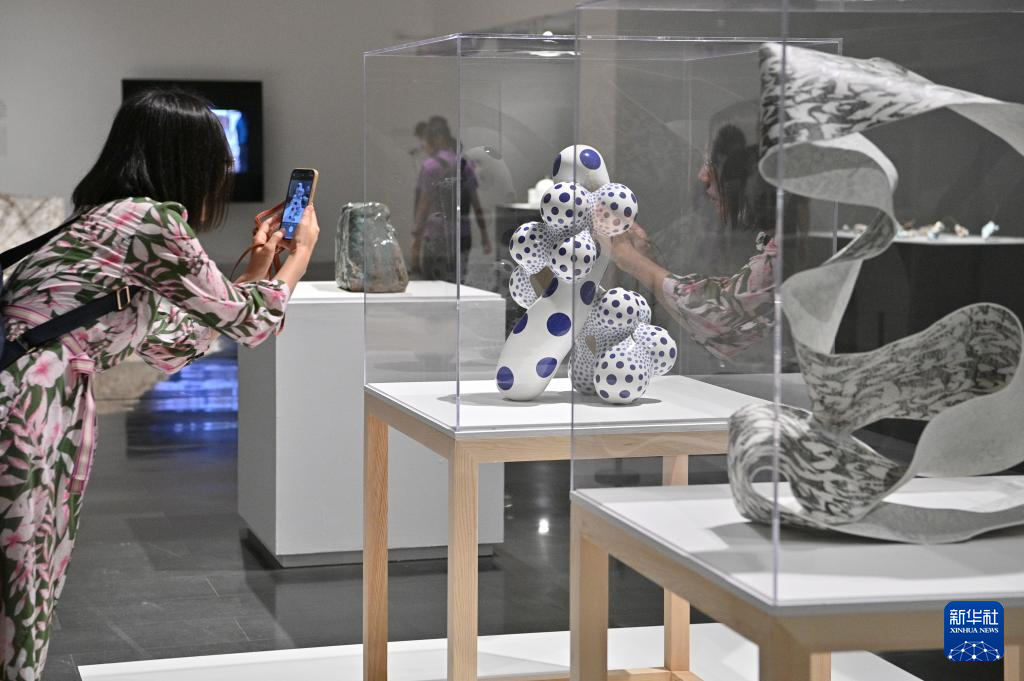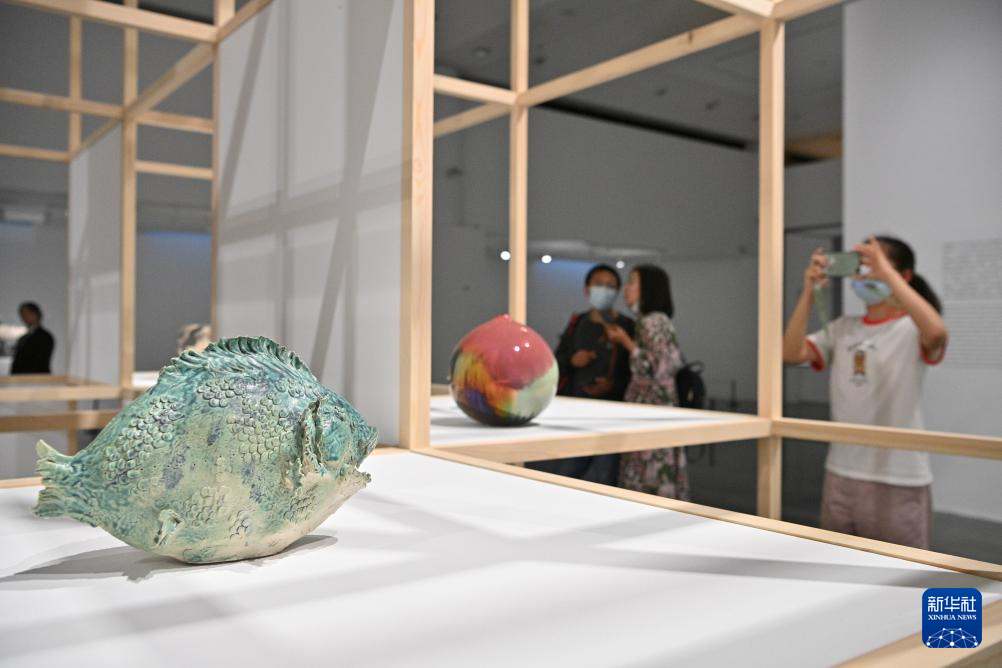 8月15日,參觀者在清華大學藝術博物館欣賞中外藝術家的陶藝作品。