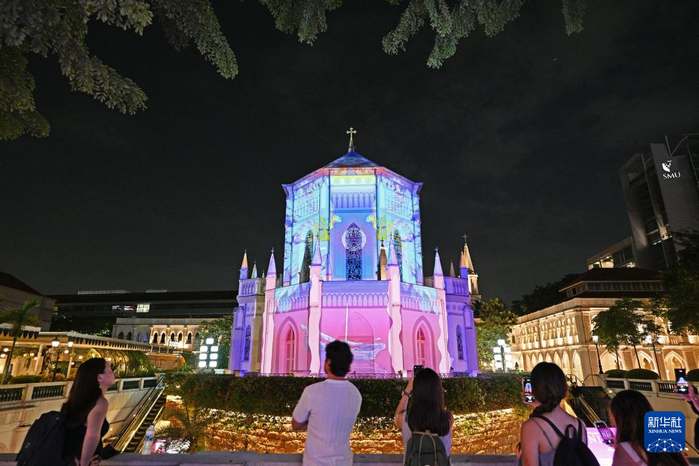 8月16日,觀眾在新加坡舉行的“新加坡仲夏夜空”藝術活動預展上欣賞燈光投影秀。