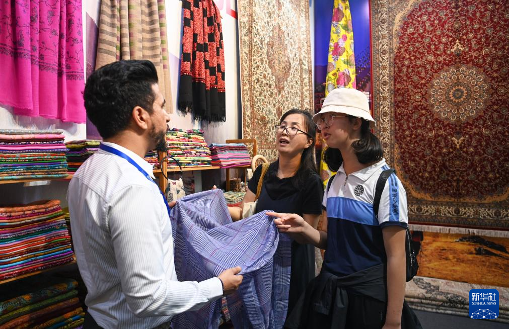 8月17日,參觀者在交流合作館尼泊爾展區了解特色商品。新華社記者 鄒競一 攝