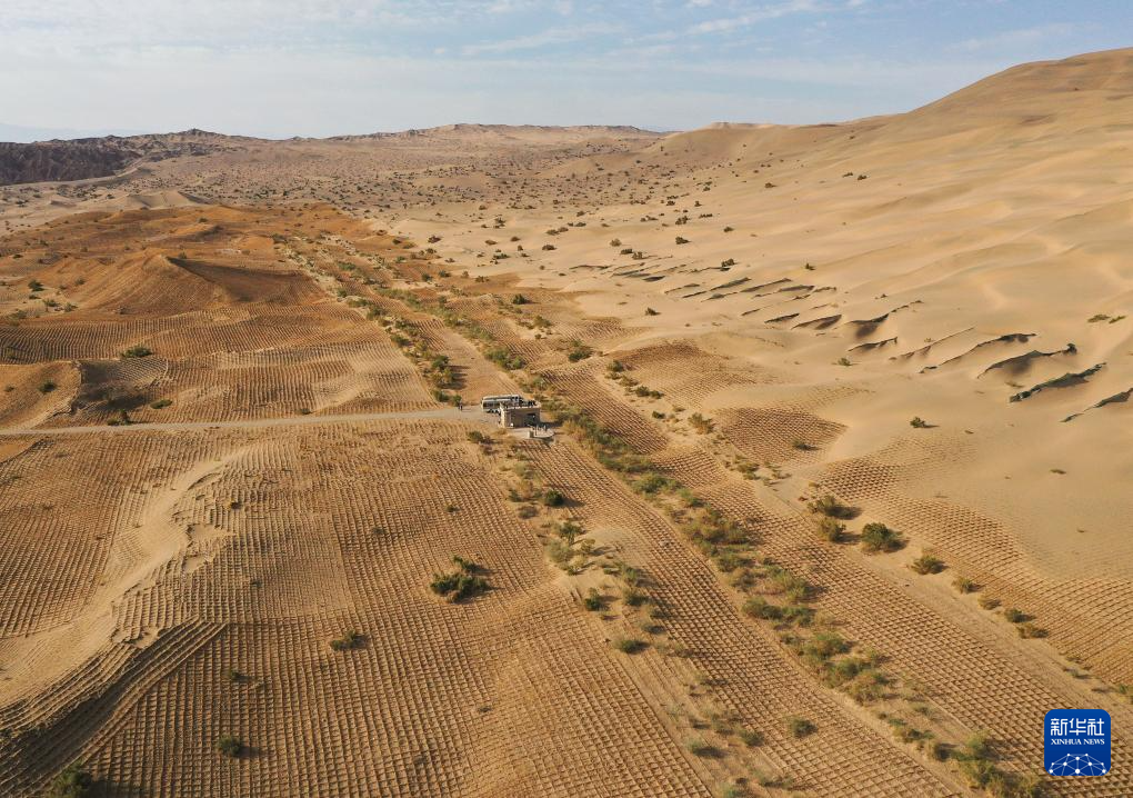敦煌莫高窟崖體頂部戈壁帶和沙地上采用草方格、灌木植物固沙等綜合治沙措施保障石窟的防風固沙安全。監測結果表明,經過多年對流沙的持續治理,莫高窟受風沙影響情況得到了有效控制(8月4日攝,無人機照片)。