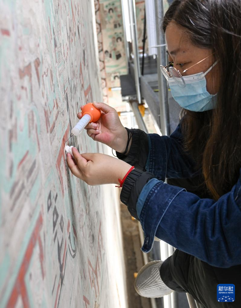 在敦煌莫高窟正在保護修繕的第55窟內,文保工作者對壁畫進行加固修復(8月3日攝)。