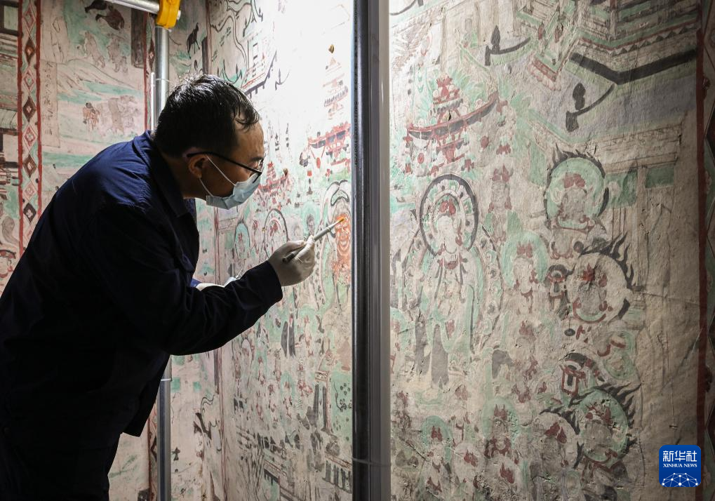 在敦煌莫高窟正在保護修繕的第55窟內,一位文保工作者對壁畫進行修復(8月3日攝)。