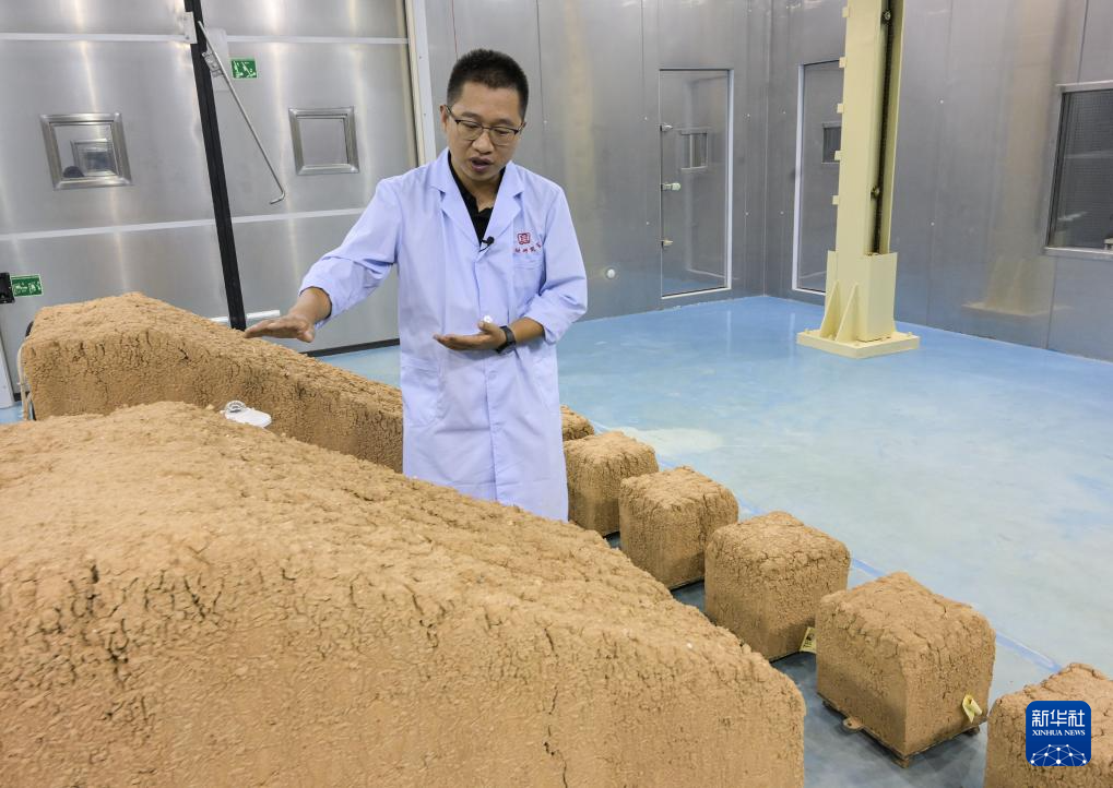 在敦煌研究院多場耦合實驗室內,一位工作人員觀察針對鎖陽城夯土模型所進行的環境模擬實驗情況(8月3日攝)。