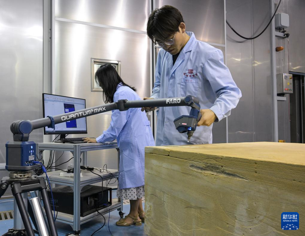 在敦煌研究院多場耦合實驗室中,工作人員對慶陽北石窟寺砂巖樣品進行三維掃描分析(8月3日攝)。