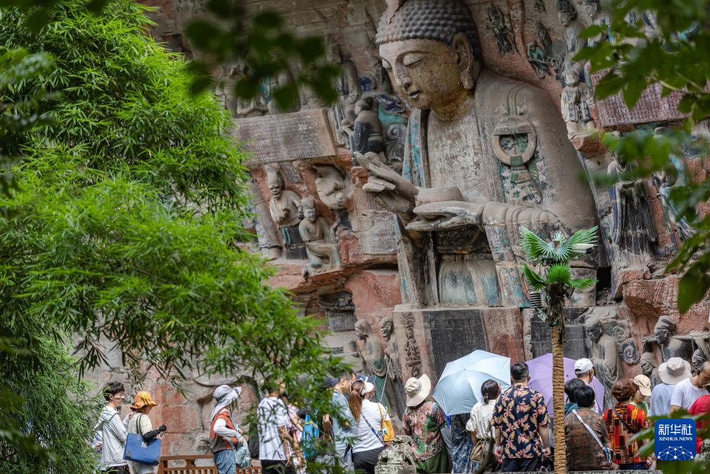 8月19日,游客在大足石刻寶頂山景區參觀。