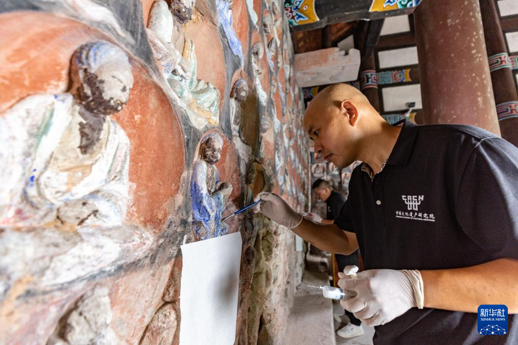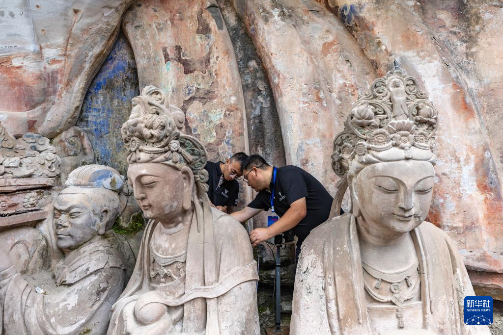 8月19日,在大足石刻寶頂山景區,工作人員對石刻造像病害進行處理。