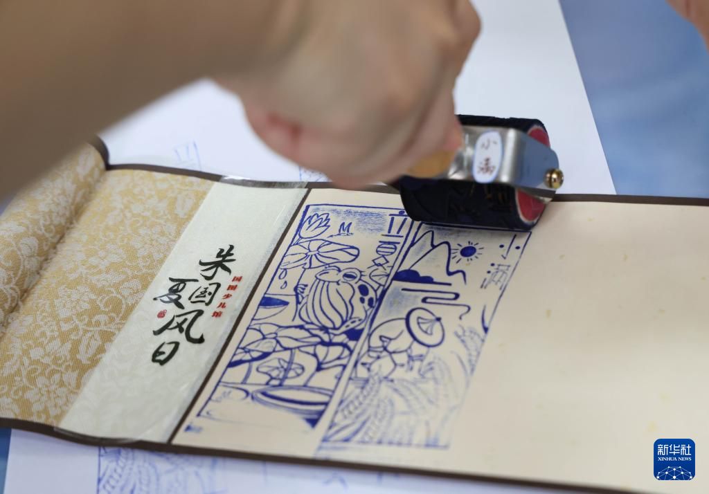 8月20日,在“朱夏國風日”傳統文化沉浸式體驗活動中,國家圖書館工作人員為孩子們制作國風卷軸。