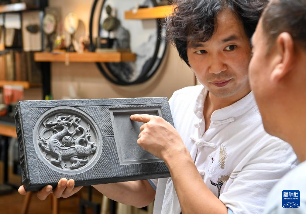 倪朋輝(左)向來賓展示“東方蒼龍”磚雕作品(8月25日攝)。