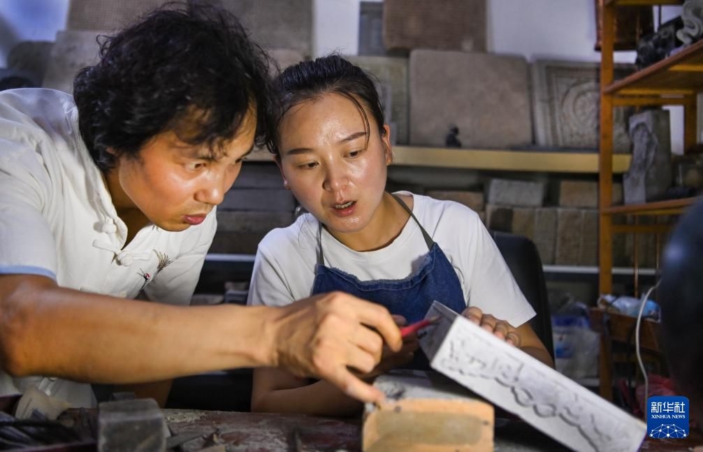 倪朋輝與妻子陳芳在工作室一起探討磚雕創作構思(8月25日攝)。