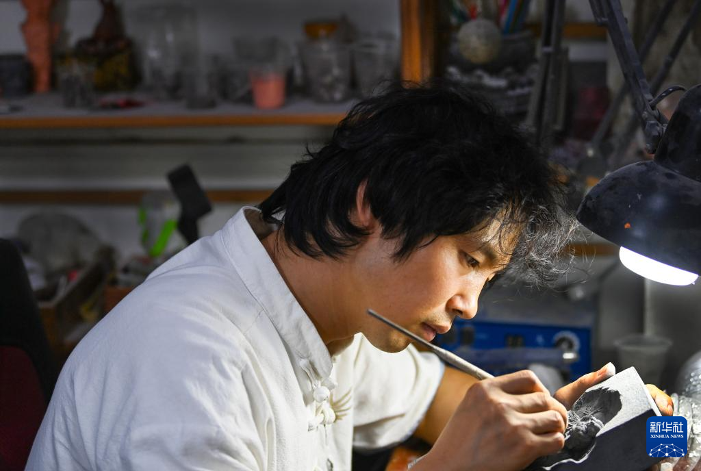 倪朋輝在工作室精心創作磚雕作品(8月25日攝)。
