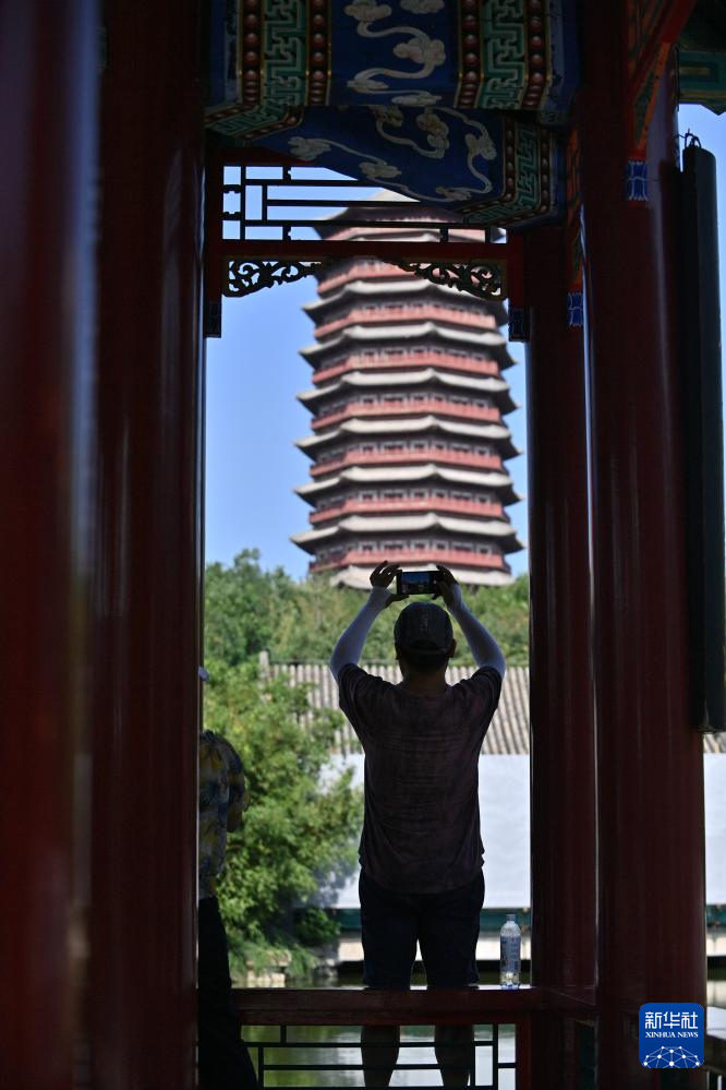 8月28日,參觀者在中國園林博物館鏡影亭參觀。