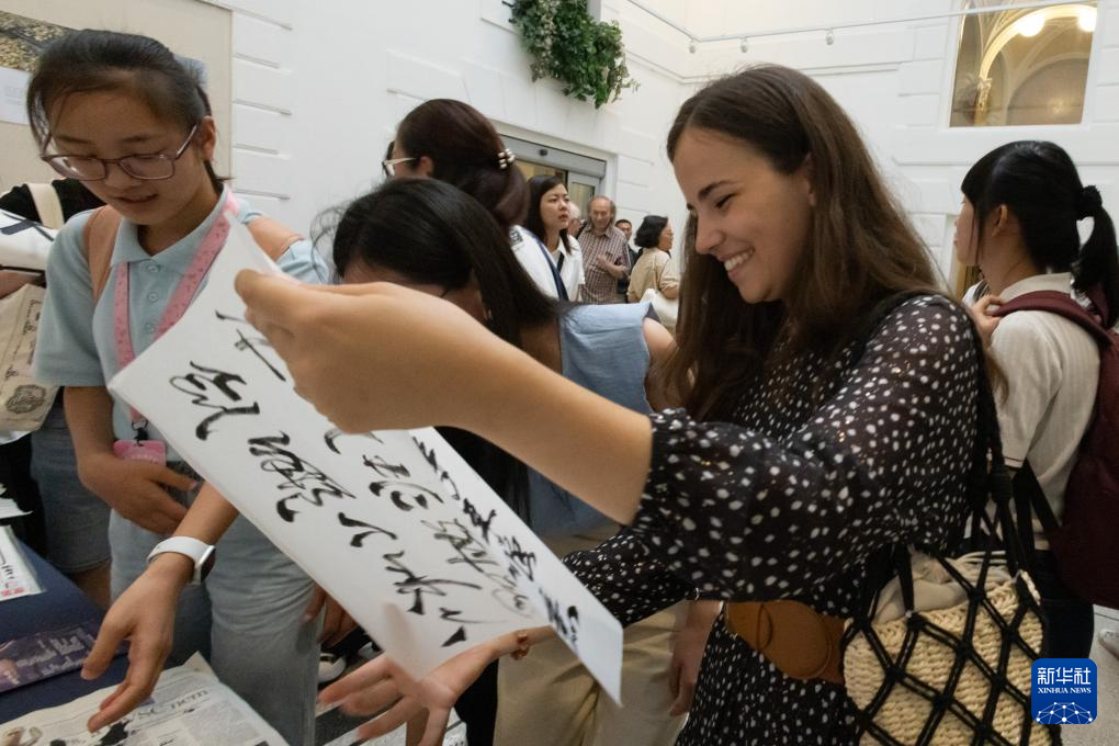 8月29日,嘉賓在匈牙利布達佩斯體驗中國書法。