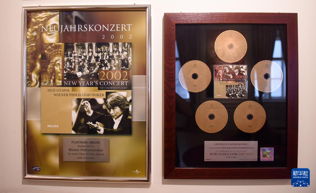 這是9月2日在奧地利維也納“音樂之家”拍攝的2002年維也納新年音樂會海報和唱片。