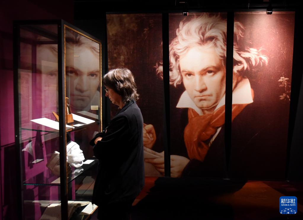 9月2日,一名觀眾在奧地利維也納“音樂之家”貝多芬展廳參觀展品。