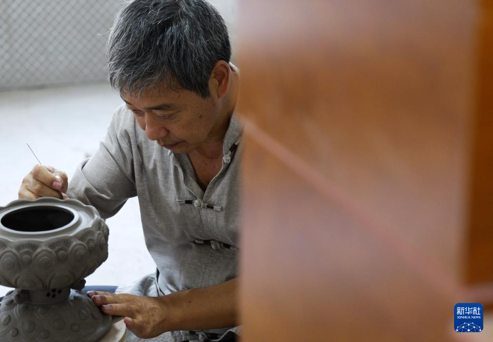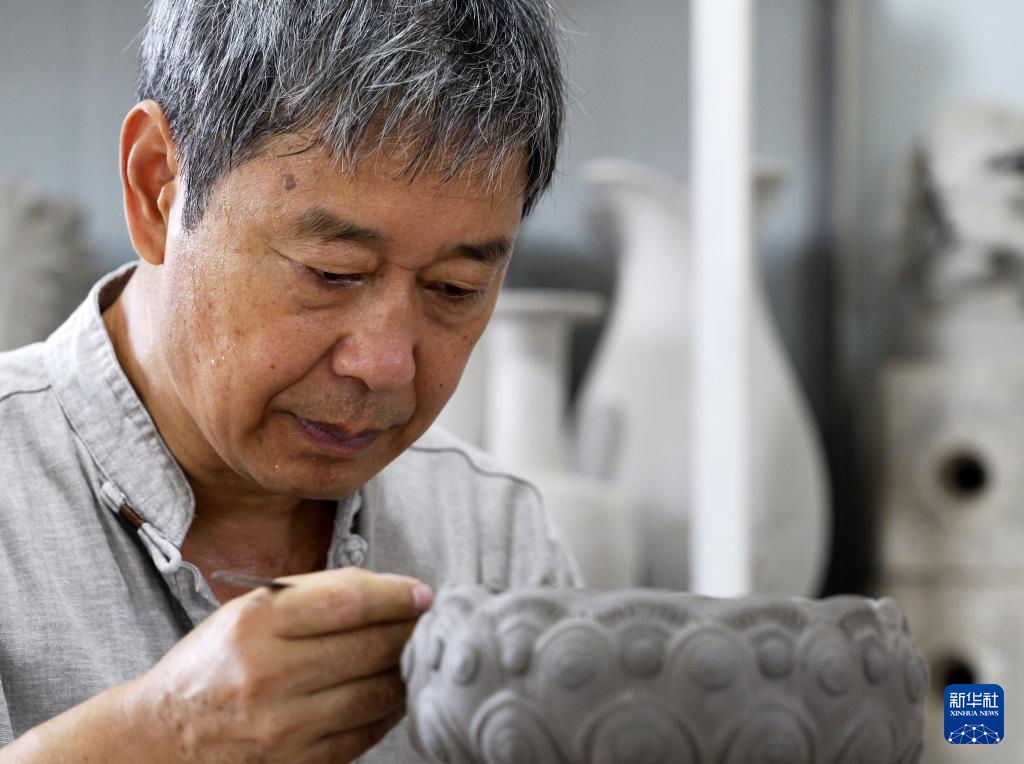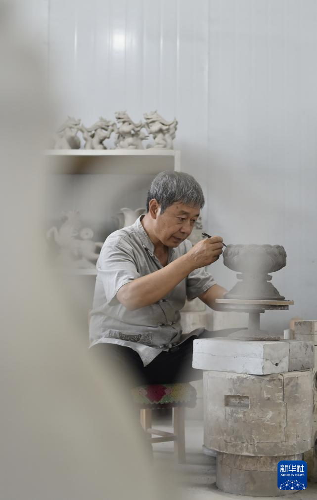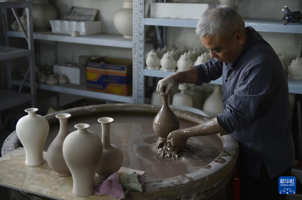8月31日,在清涼寺村的一家汝瓷生產企業,汝瓷藝人劉國和在車間里加工素坯。