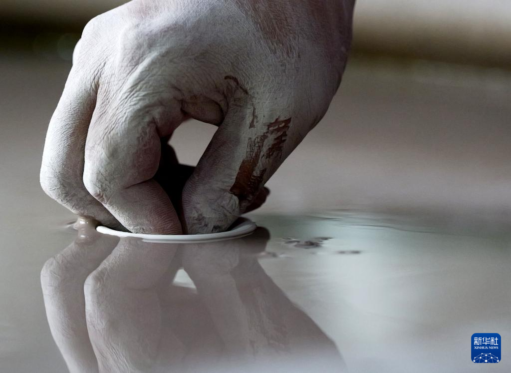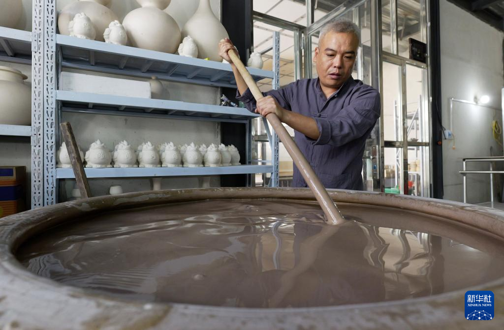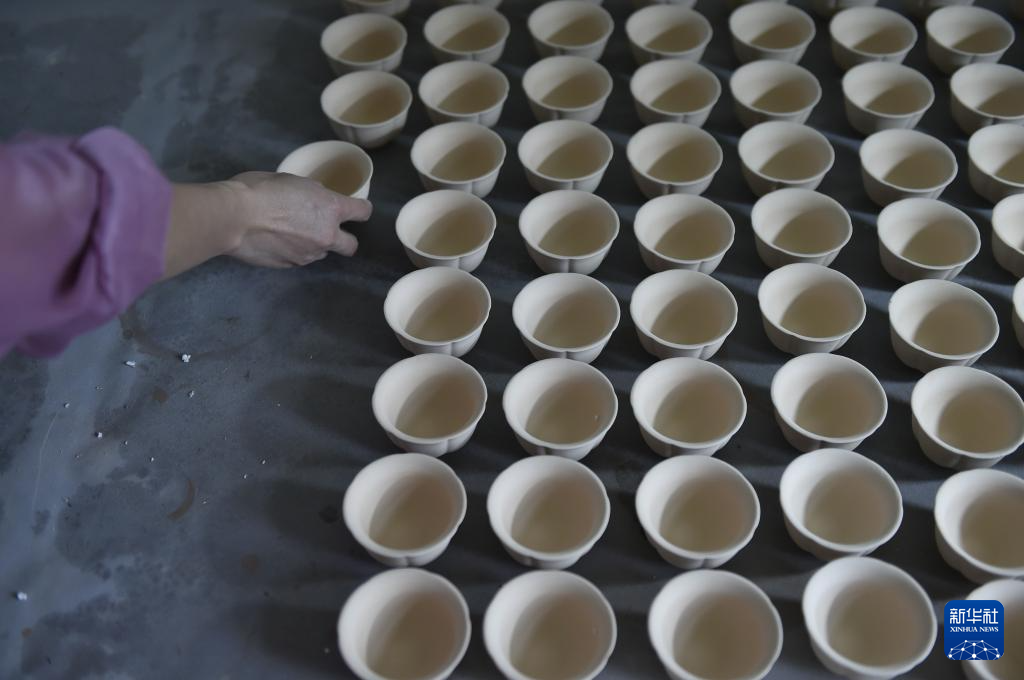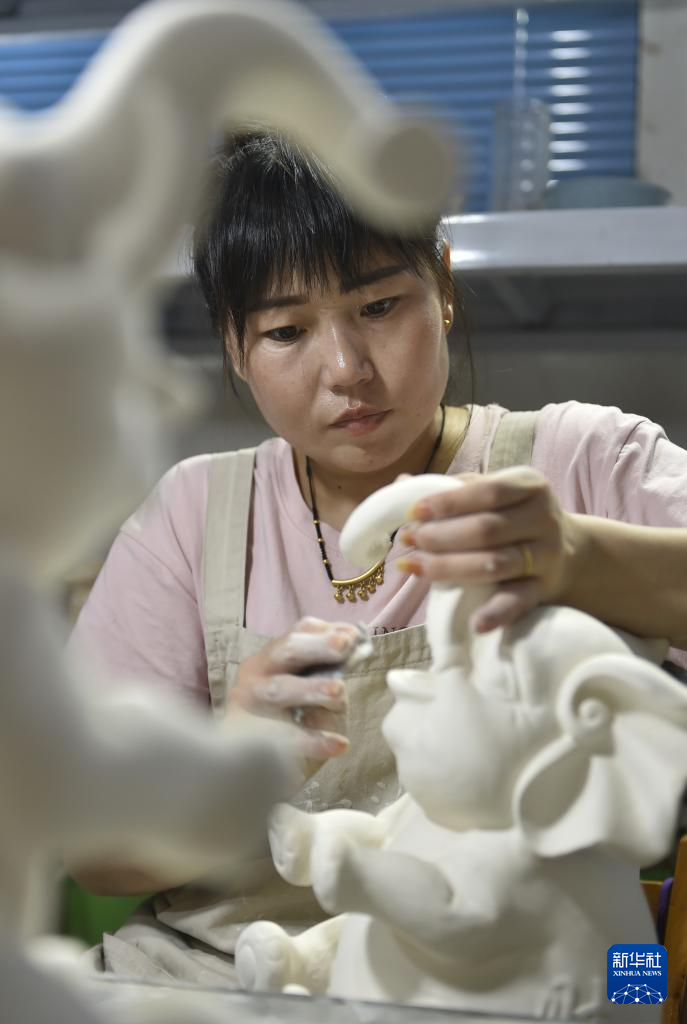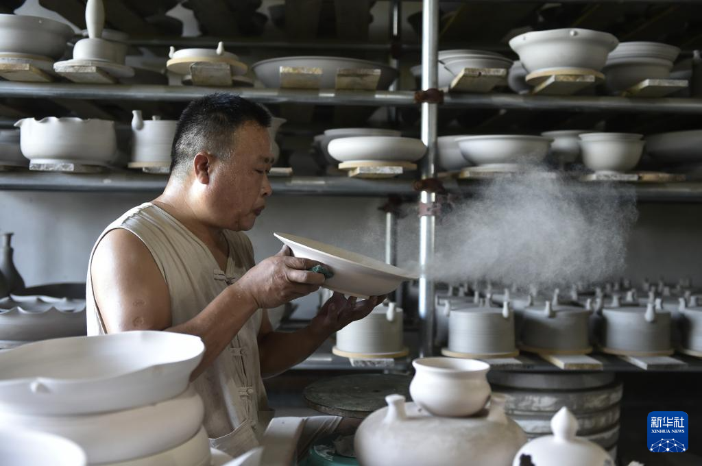 8月31日,在清涼寺村的一家汝瓷生產企業,工作人員在車間里修坯。