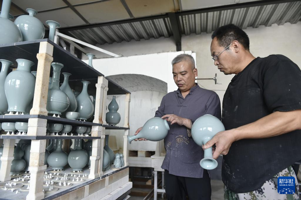 8月31日,在清涼寺村的一家汝瓷生產企業,汝瓷藝人王占穩(左)和工人在車間里檢查燒制完成的汝瓷產品。