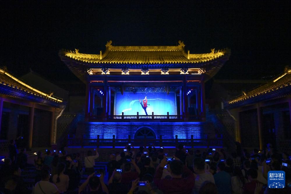 8月31日,游客在陜西延安的金延安文化旅游產業園區觀看紅色歌舞劇《延安十三年》。