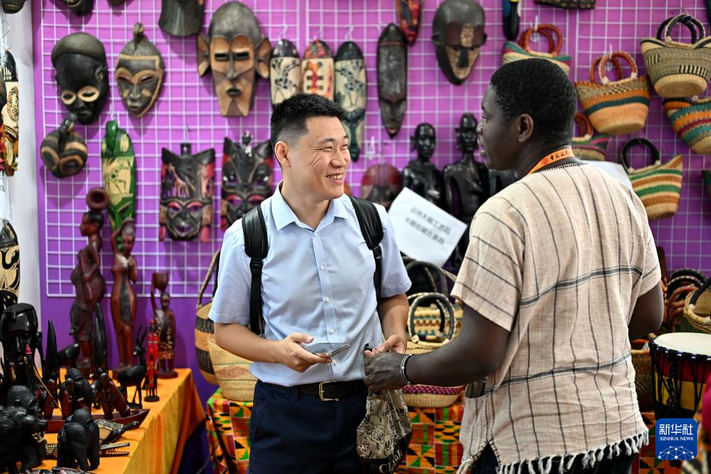 9月6日,一名參觀者在服貿會文旅服務專題展區烏干達展臺購買手工藝品。