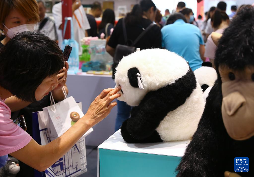 9月6日,參觀者在服貿會文旅服務專題展區觀看北京動物園展臺展出的一款大熊貓玩偶。