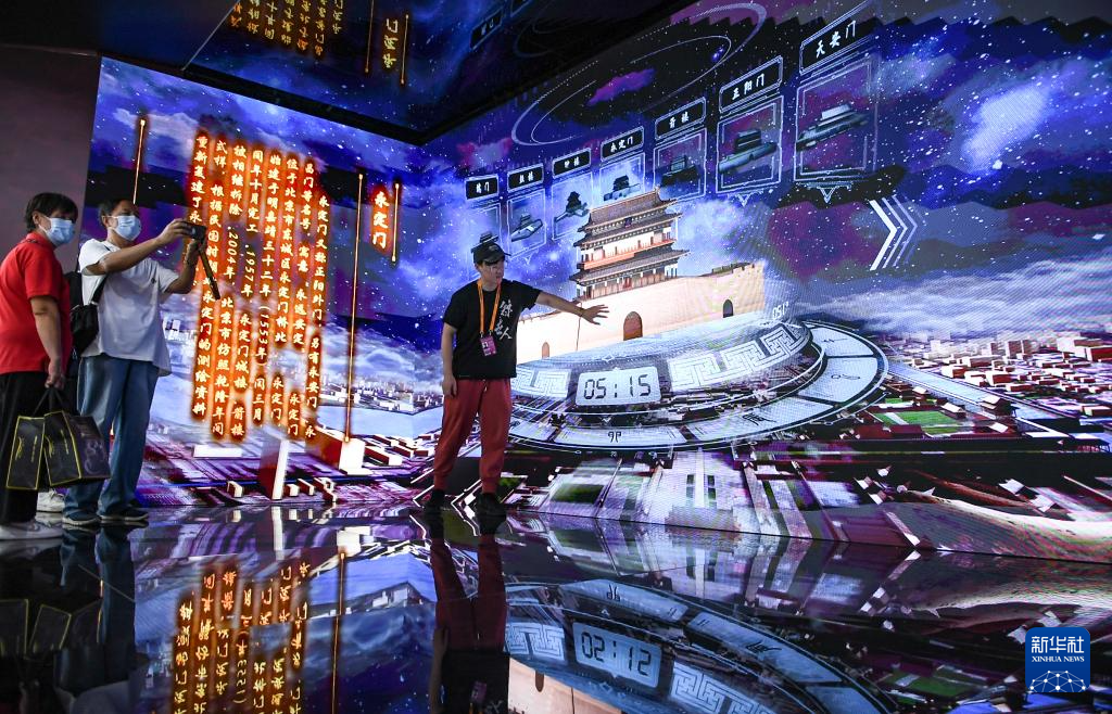 9月6日,北京鯨世科技公司的工作人員(右一)在服貿會文旅服務專題展區向觀眾演示展現北京中軸線的無穿戴交互產品。