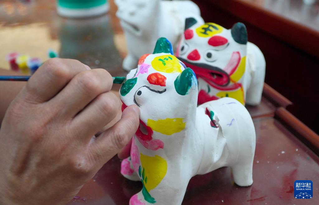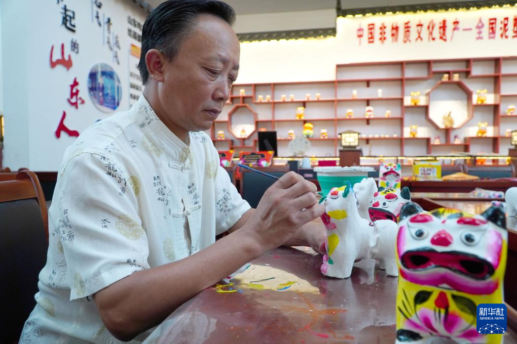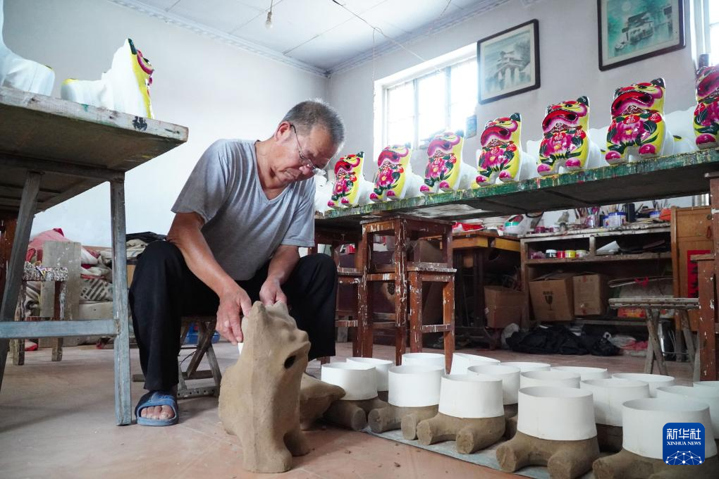 9月5日,在山東省高密市姜莊鎮的一處非遺工坊,村民聶祥之在制作泥老虎產品。