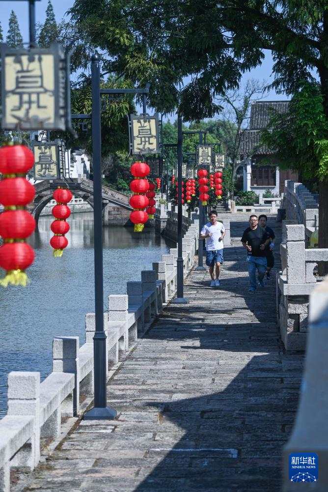 9月6日,慢跑愛好者在湖州市吳興區織里鎮組團跑步。
