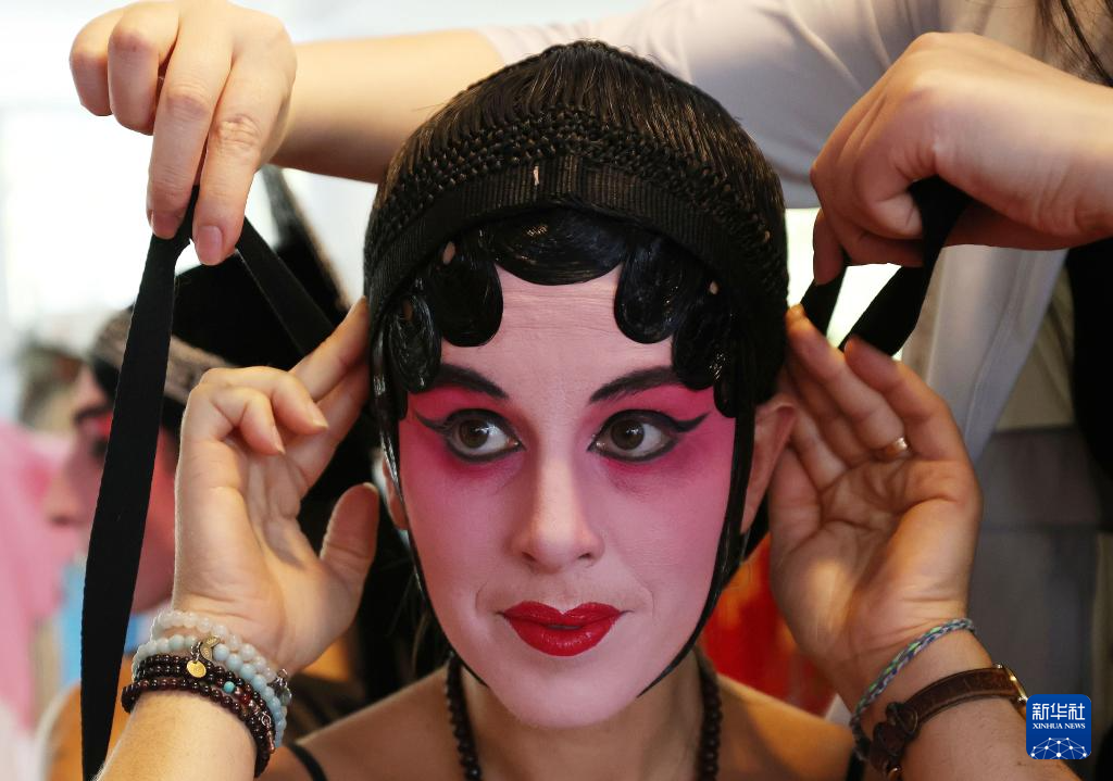 9月9日,在法國巴黎中國文化中心,法國觀眾體驗昆曲旦角扮相。新華社記者 高靜 攝