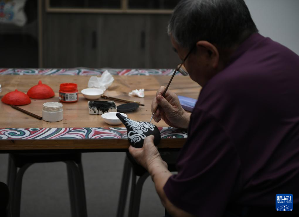 9月8日,在陜西寶雞市西府里文化藝術村,中國工藝美術大師、陜西省非物質文化遺產社火臉譜繪制技藝代表性傳承人李繼友在繪制馬勺臉譜。