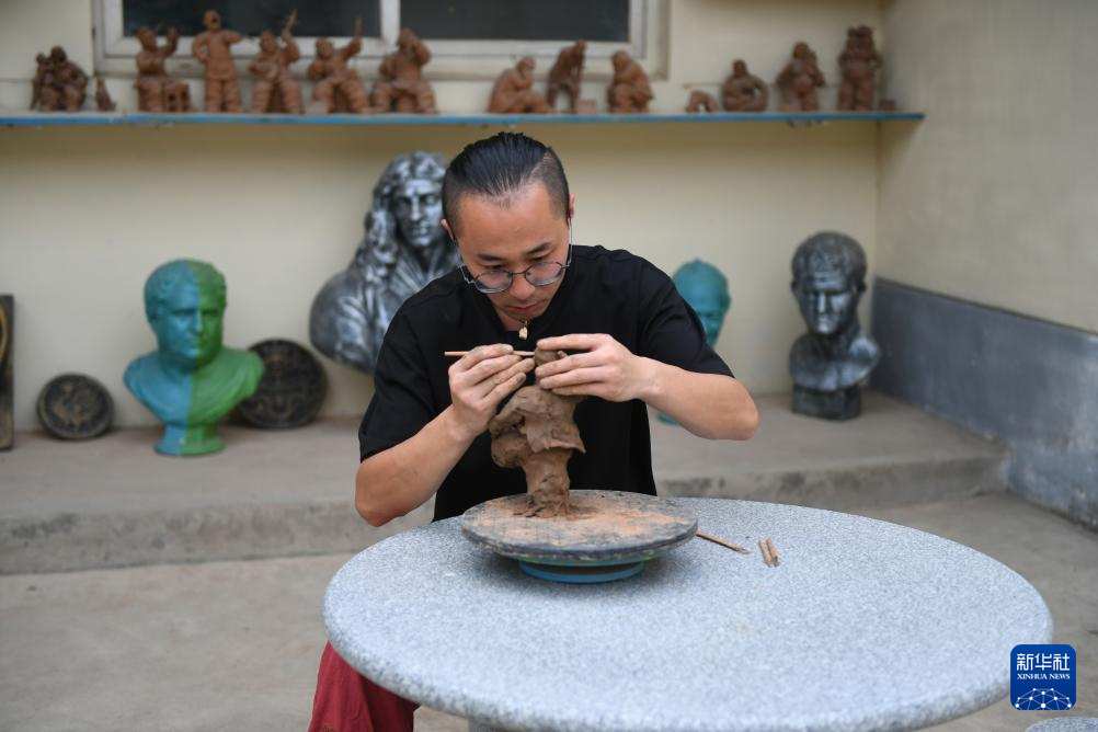 9月8日,在陜西寶雞市西府里文化藝術村,金臺區非物質文化遺產“周氏泥塑”技藝傳承人周少平在創作泥塑作品。