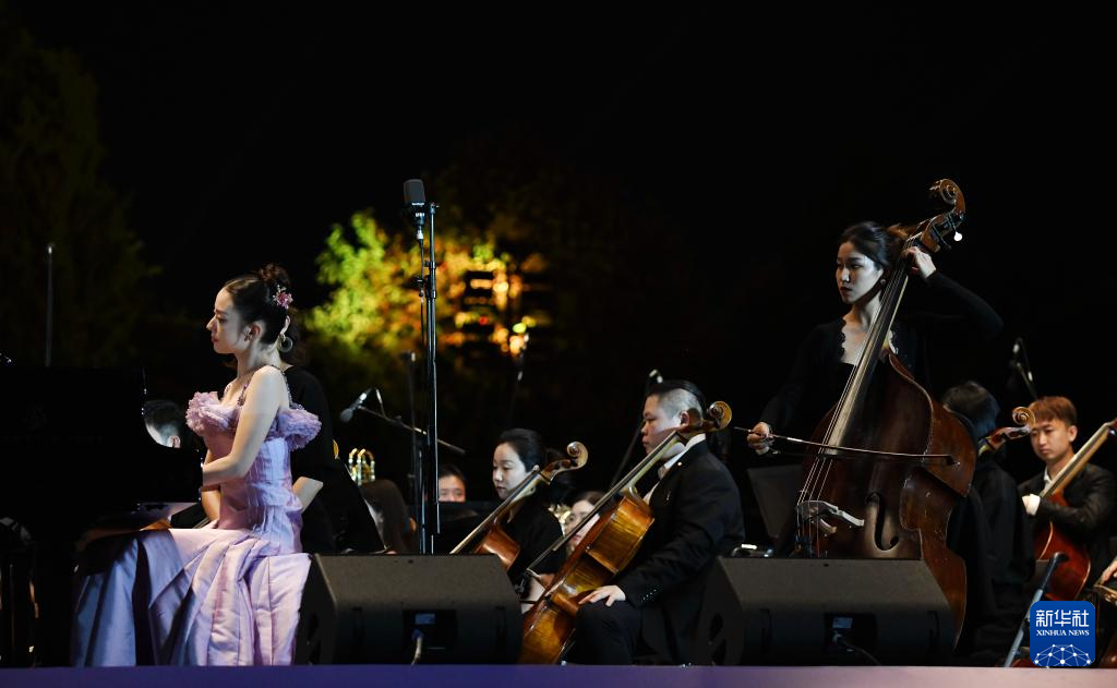 9月10日晚,鋼琴家吉娜·愛麗絲(前左)與西安交響樂團在西安大雁塔北廣場戶外公演。