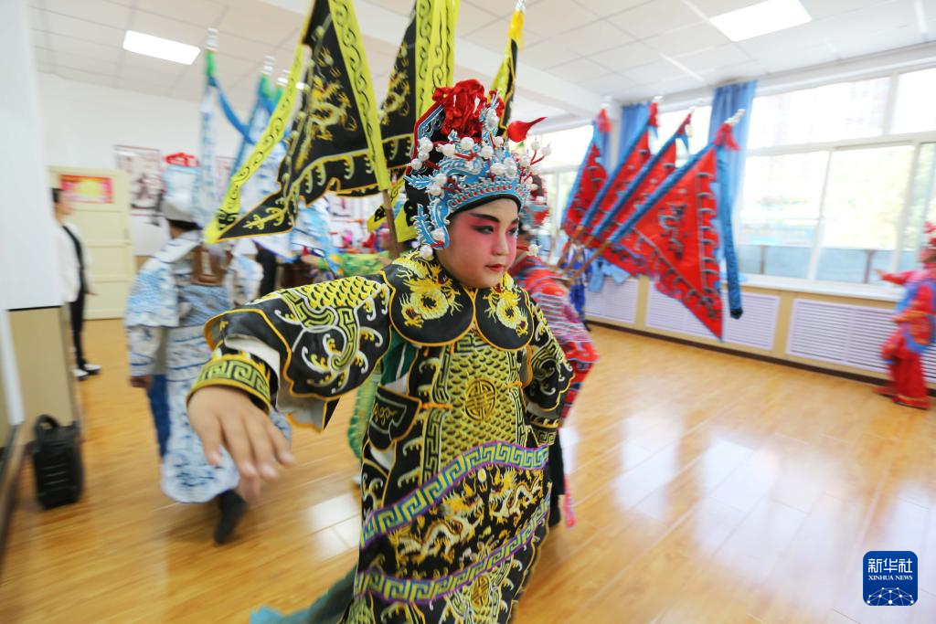 9月13日,在甘肅省定西市安定區福臺小學,戲曲社團的學生們在排練《秦腔聯唱》。